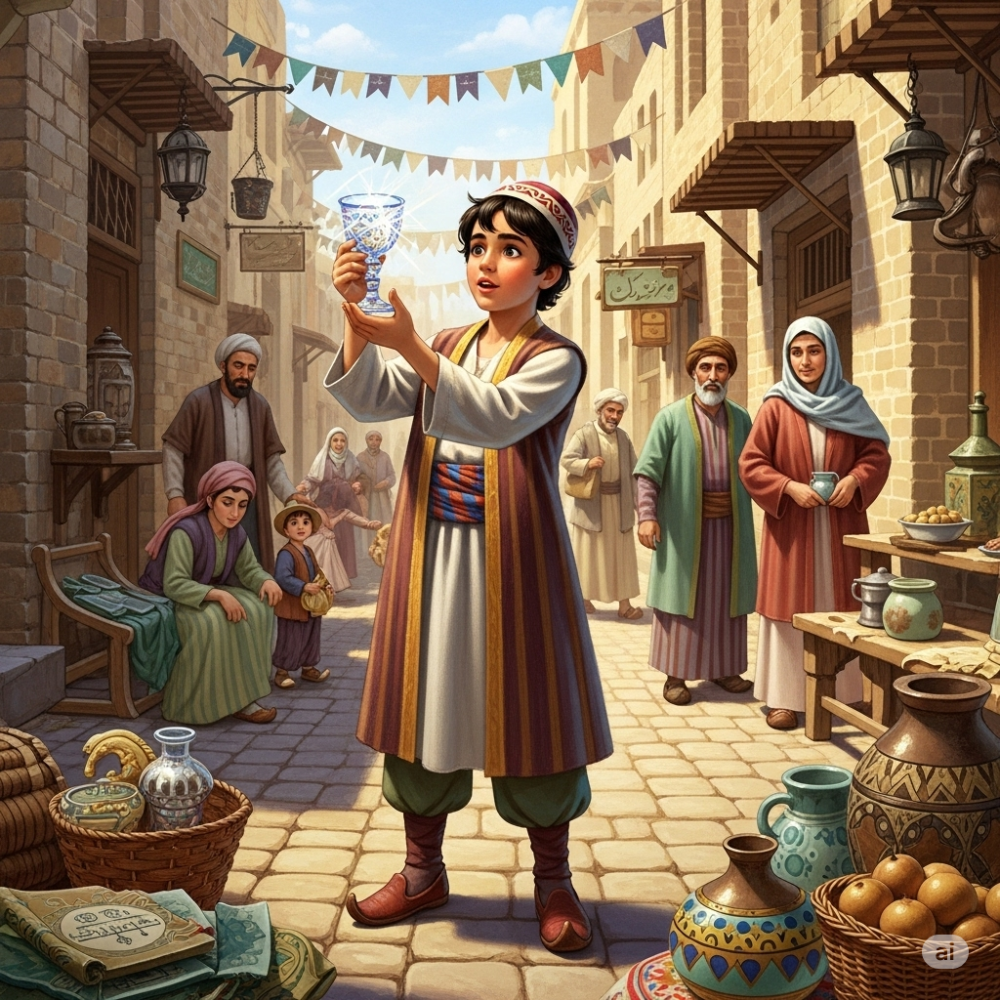 The King smiled. “Then you shall have it.” He gave Abdullah a fine shop in the city and invited Ahmed to study at the royal library. From then on, Ahmed used the crystal cup only to help others, and he and his father lived happily, surrounded by friends, kindness, and opportunity.
