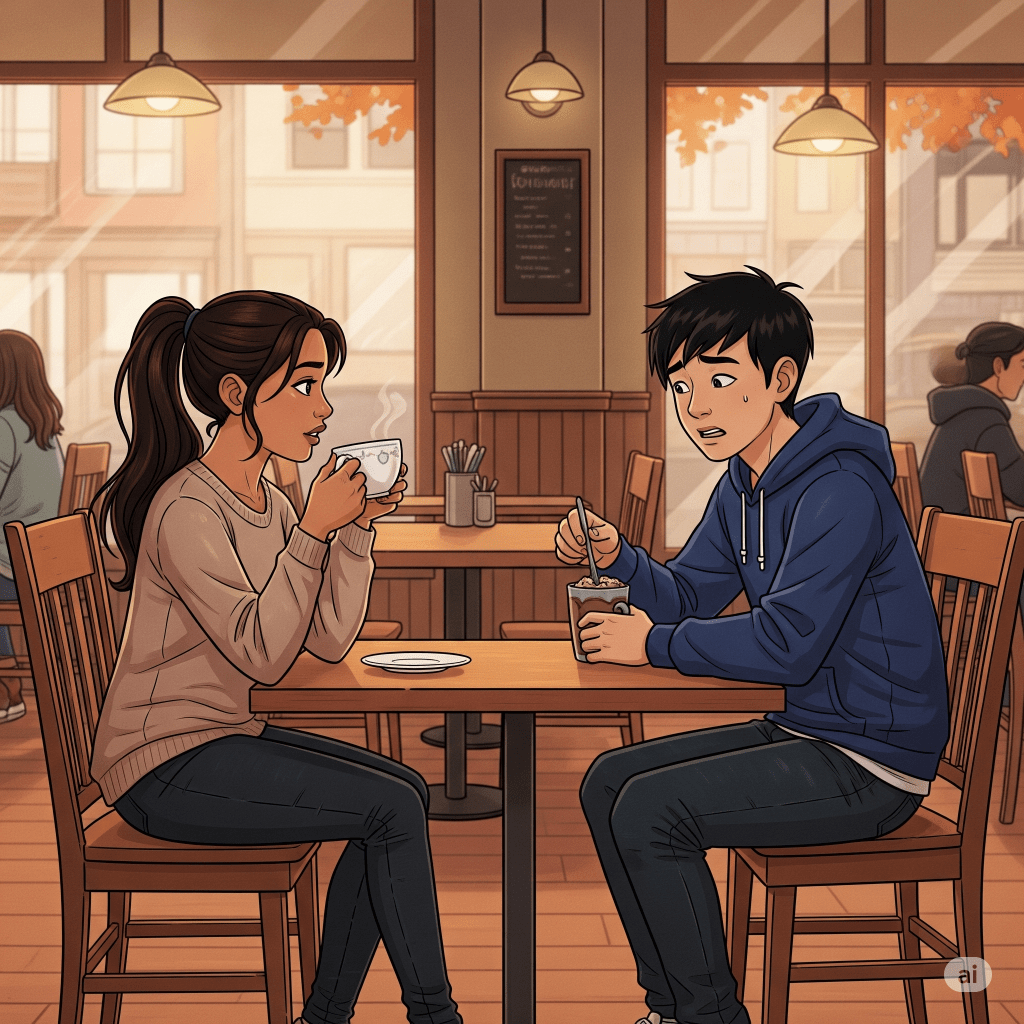 By six o’clock, the café near Lincoln High had emptied out. The hum of the espresso machine had quieted, and the windows glowed gold against the deepening dusk. Nora Bennett sat at a corner table, legs tucked beneath her, turning a spoon slowly in her tea. Across from her, Marcus Lin stared into the last swirl of his hot chocolate, silent.