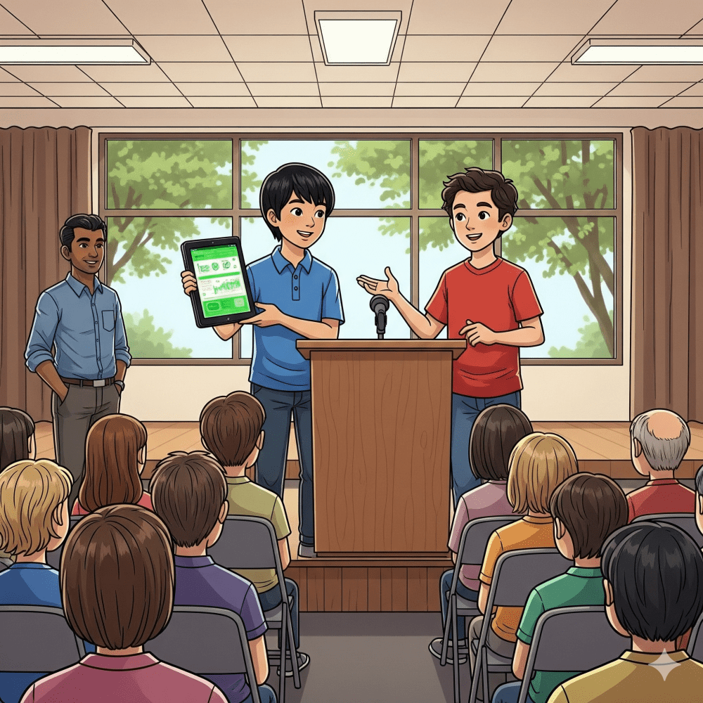 Eli began, steady and clear. “Our app helps students sort recycling. Scan, sort, submit.” He held up the tablet. “Noah, hit submit?”