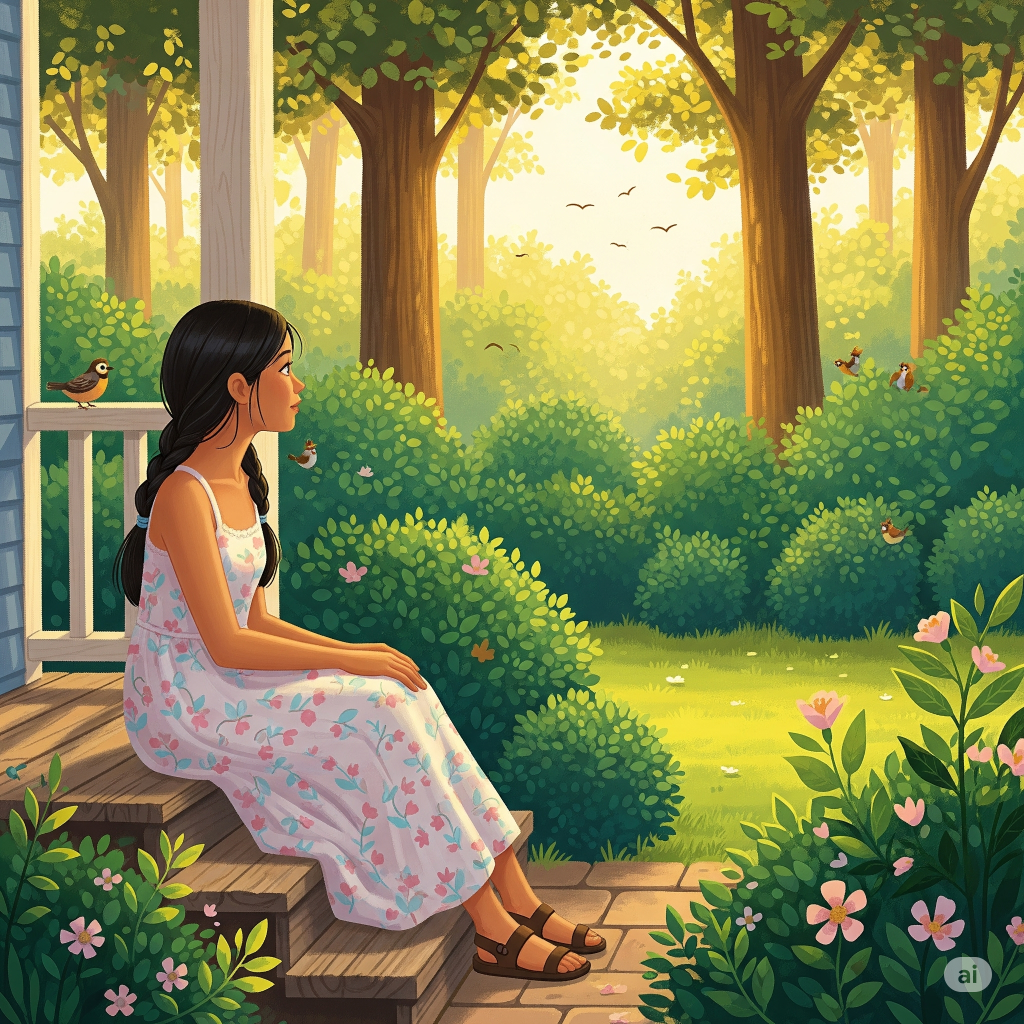On summer afternoons, when the heat pushes everyone inside, I sit in a shady chair on the back porch and watch the bird families living in the giant boxwood bushes beside the brick path. The bushes are so thick and tall, they look like green apartment buildings. My mom calls them “the Boxwood Apartments,” and now I do too.