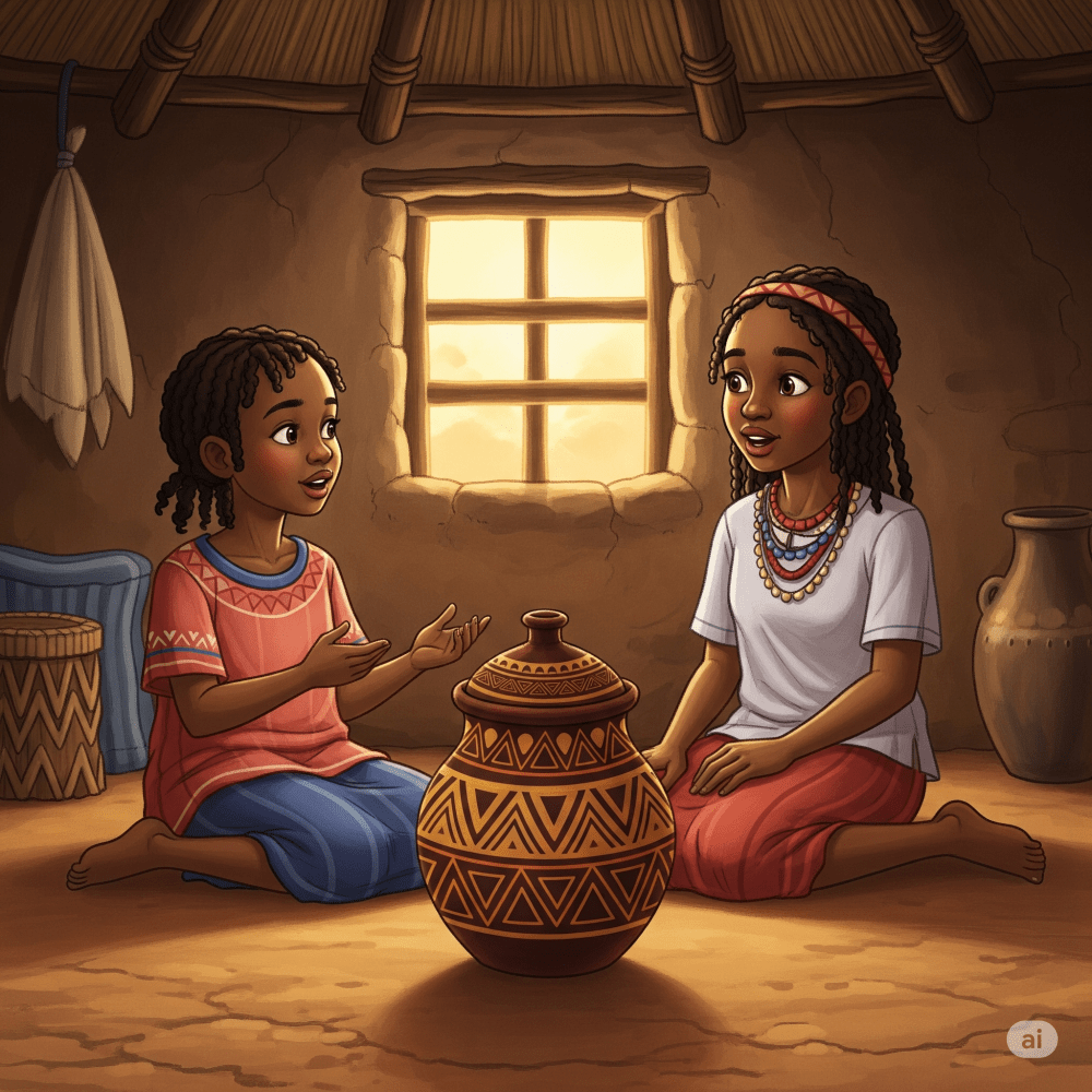 The first two days went smoothly. Mira cooked, Lani swept the floor, and they ate simple meals together. But on the third day, a storm kept them inside. The wind howled, and rain tapped on the windows. Bored, Lani stared at the clay pot.