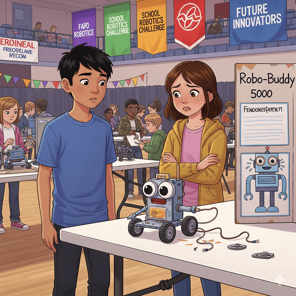 Instead, Jake decided to “add flair.” He taped googly eyes to the robot and stacked leftover wires in a tower. When the judges arrived, the tower collapsed, knocking the robot to the floor. The robot’s arm snapped off.